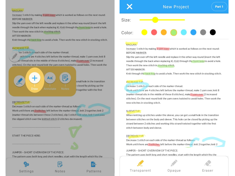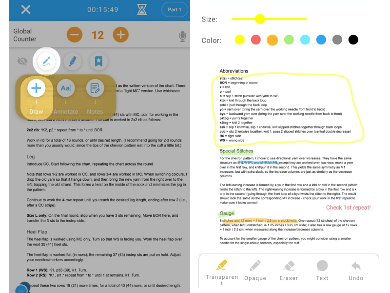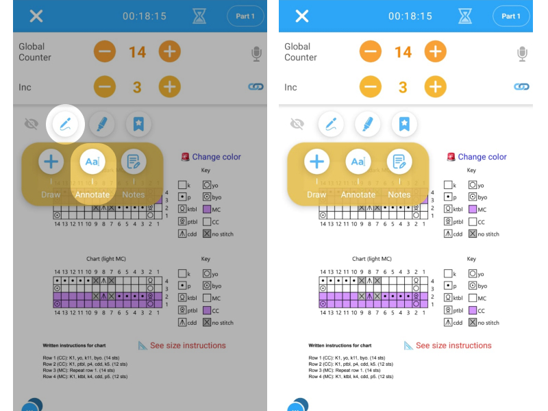 Select "Annotate" and tap long on the place where you want to add an annotation. Choose from different symbols, colors and sizes, add a title that will be displayed on the pattern and a description, which will open if you tap on your annotation later on. To delete, edit or move, tap on the annotation's icon on the pattern.
