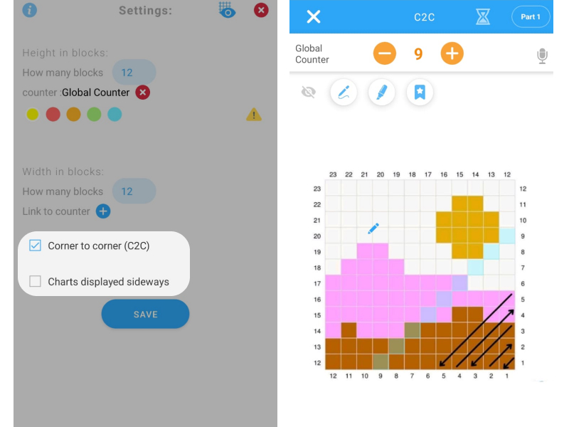 The cornert-to-corner Chart Highlighter option lets you highlight the diagonal row of the chart you are working on and moves automatically when incrementing your counter.