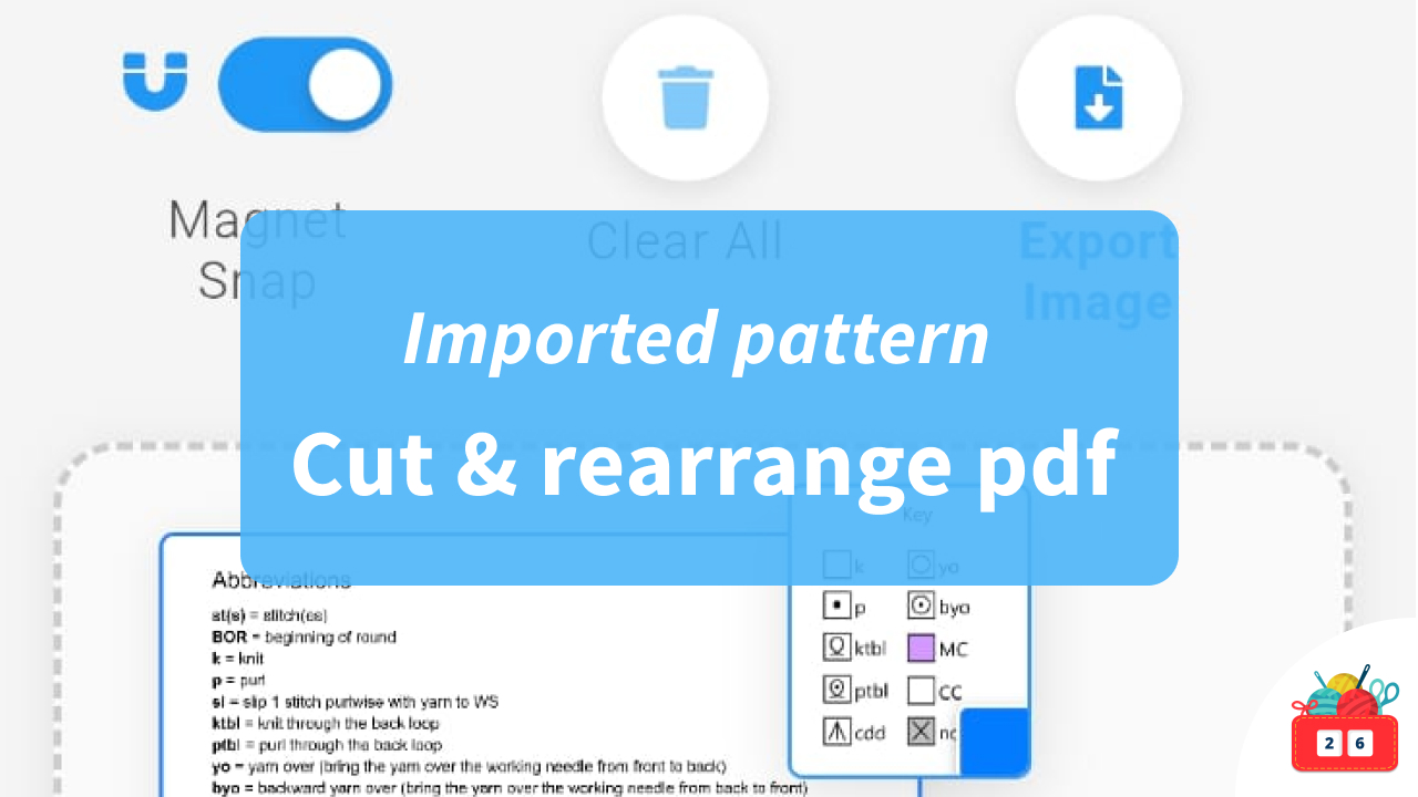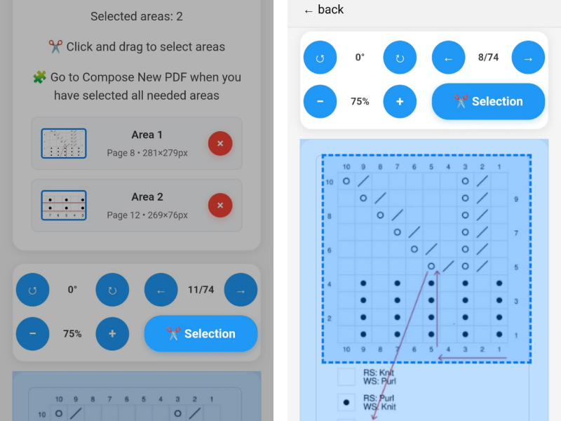 Switch to 'Compose New PDF' to arrange your pattern page by dragging sections into the bottom field. Adjust size by pulling the blue corner of your section. 'Export image' when you are done. This creates a new pattern in your new project. The original PDF will not be changed and you can always switch back to it.