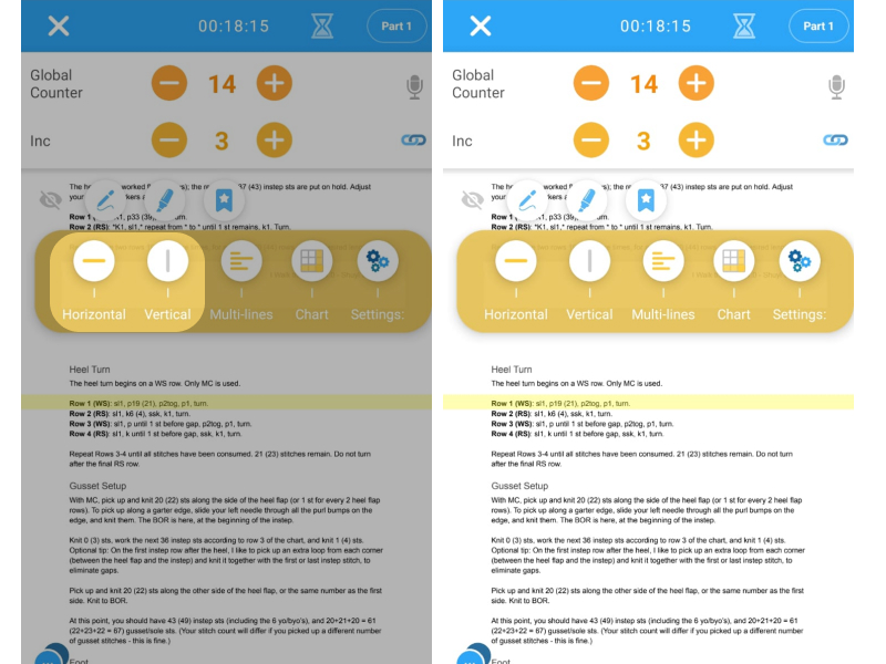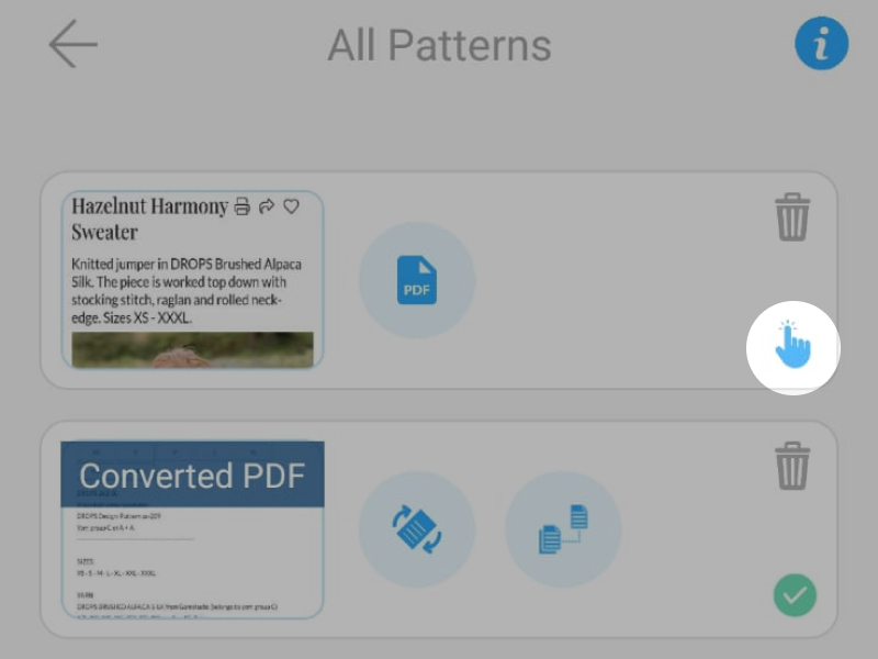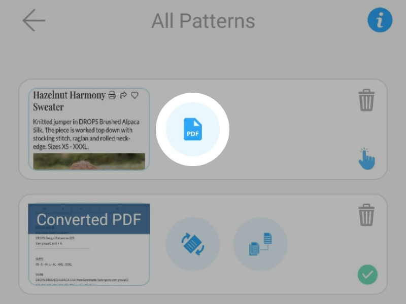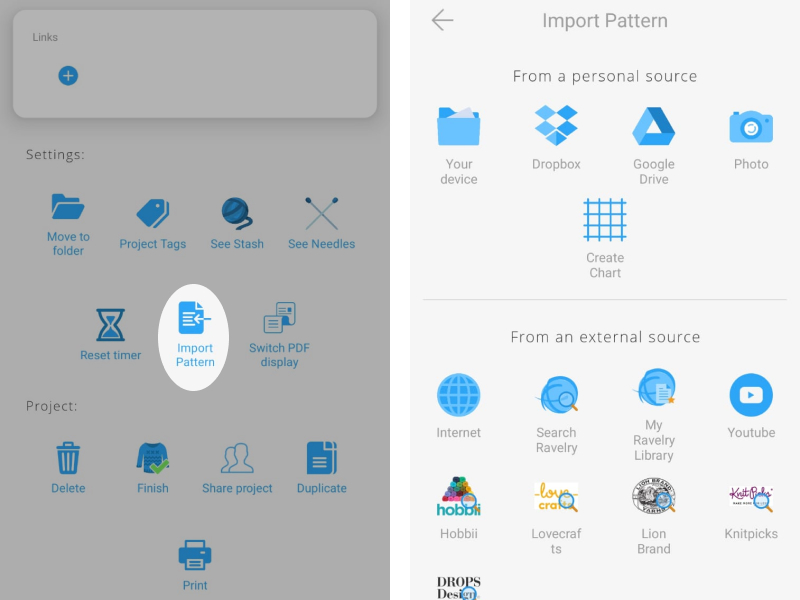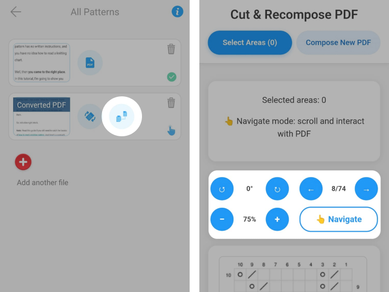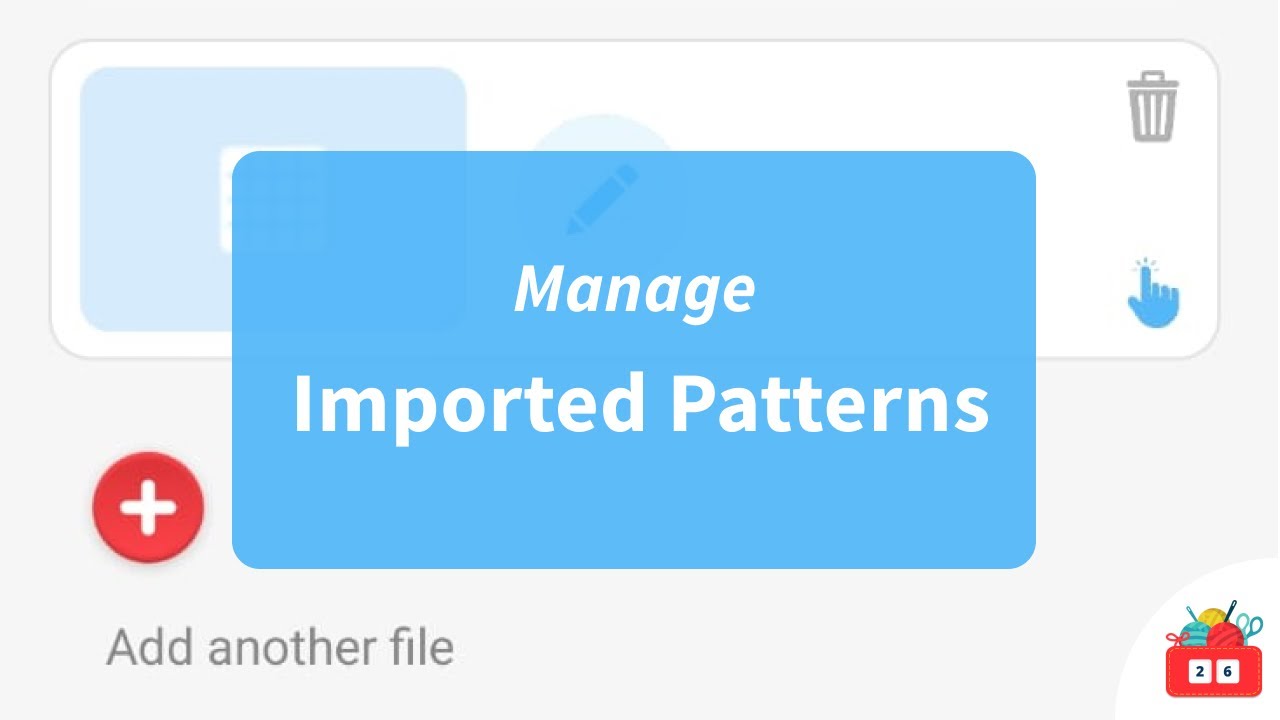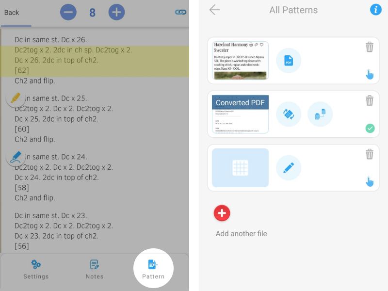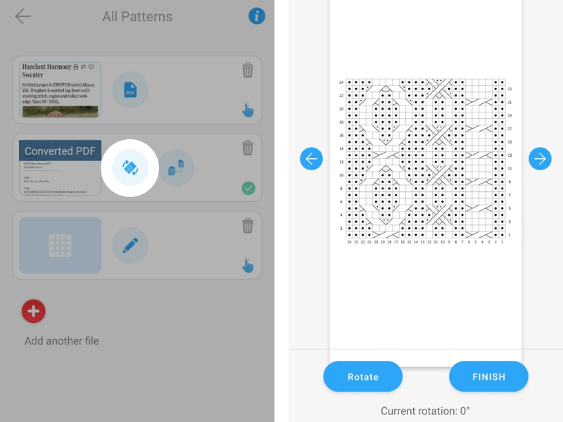 Add multiple patterns to your project or change the displayed pattern on your knitting screen by clicking on the blue "import pattern" icon. In the pattern overview you can switch between patterns, add new ones, rotate, edit or delete them.