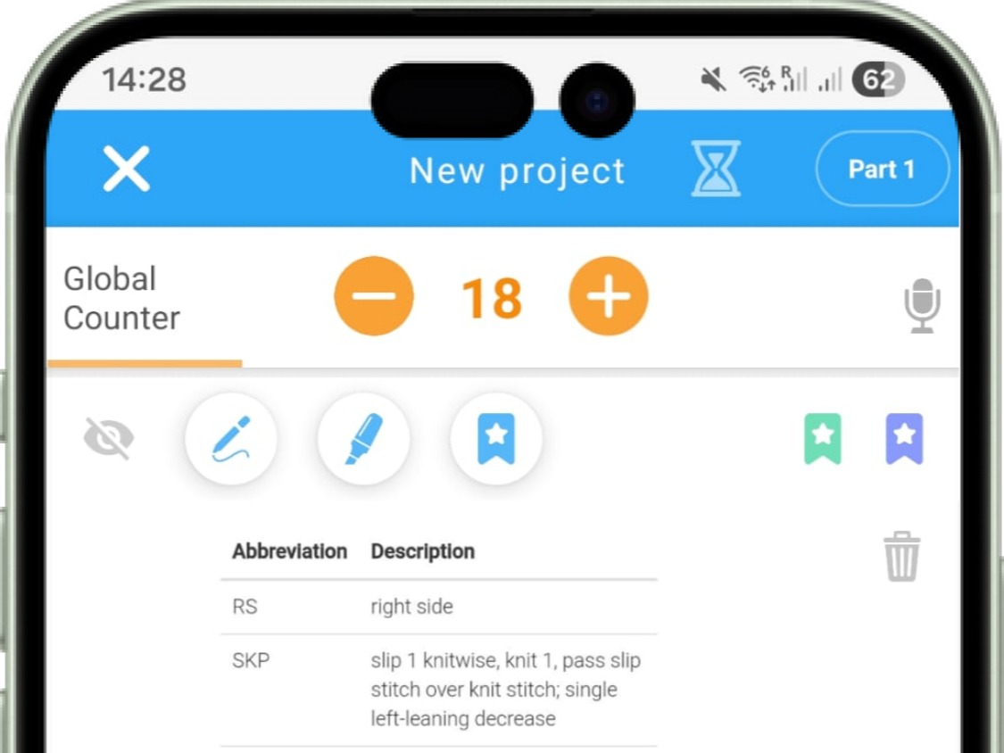 Save and display important information on your crafting screen with bookmarks! You can save a cut out from your pattern, a photo or a different file to your project and open (or hide!) it with just a tap. Save up to four bookmarks. This is especially useful for abbreviation lists, stitch patterns and other explanations!